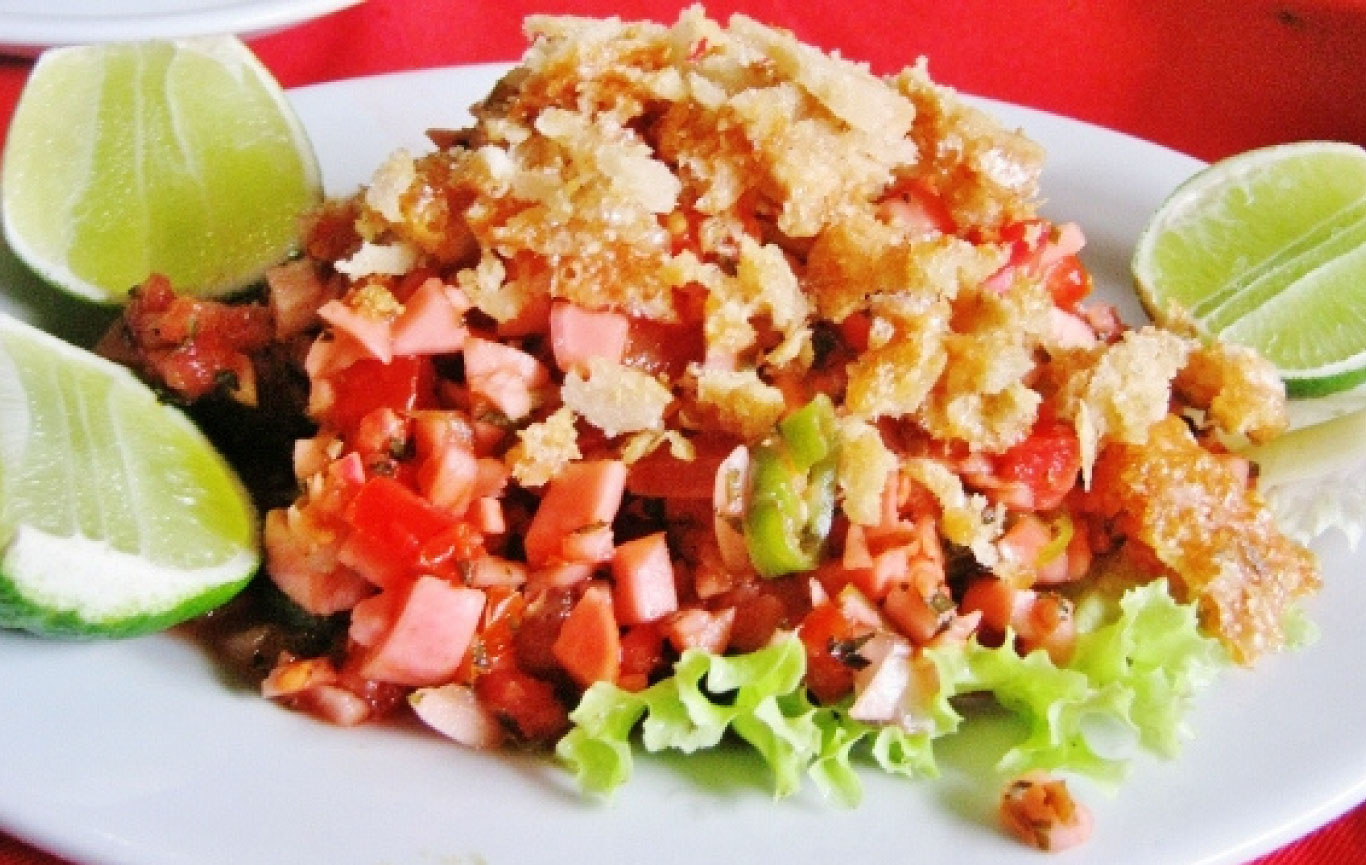 Vierta el frasco de chojín en un recipiente hondo y agregue los limones. Mezcle bien y deje reposar unos 10 minutos. Coloque un poco de chicharrón en cada tortilla y cúbralos con bastante chojín.